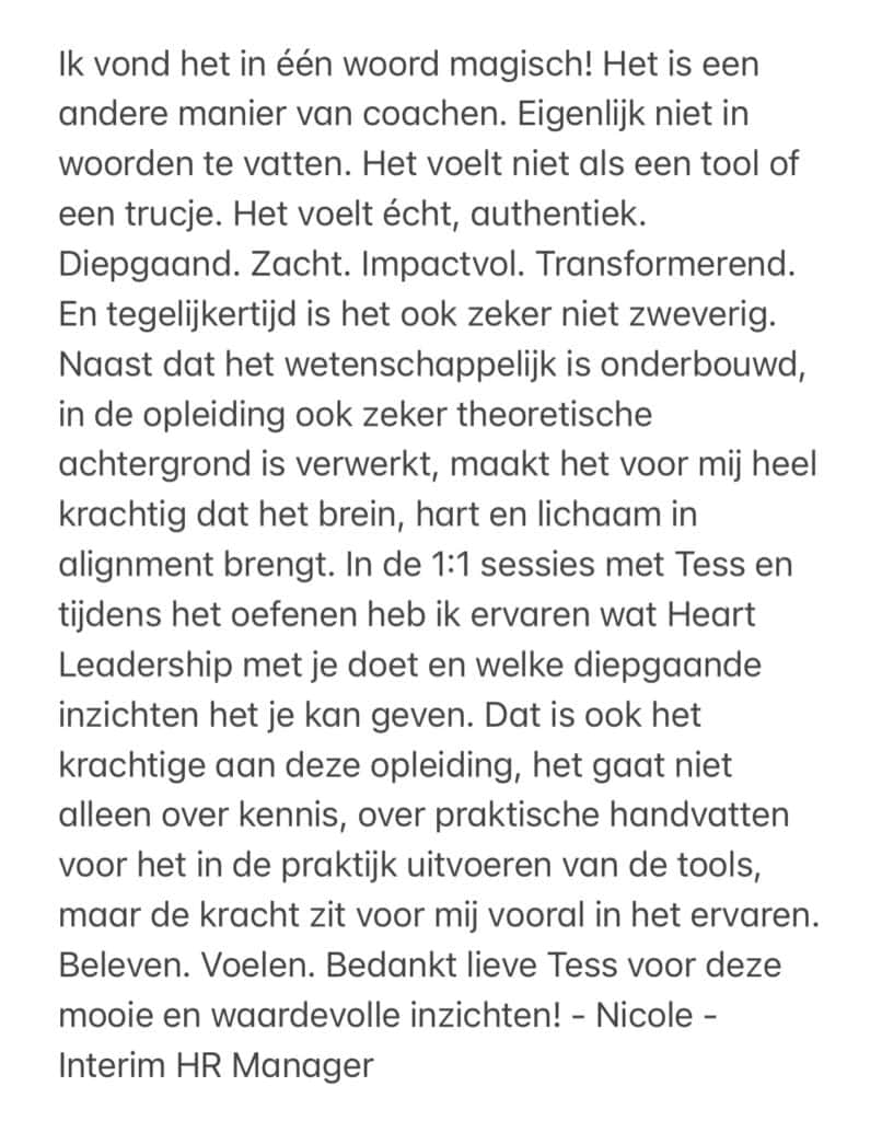 Deelnemers beoordelen de opleiding met een 9,2/10. Resultaten zijn zichtbaar in 1-op-1 sessies, teams en boardrooms. Hieronder lees je reviews en testimonials van de Heart Leadership Coaching Opleiding.